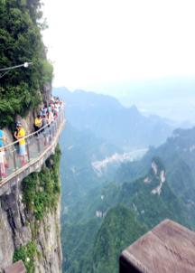 7日早上,我們來到了此行第一站——天門山。天門山海拔1500多米,因自然奇觀天門洞而蜚聲世界,被譽為“湘西第一神山”和“武陵之魂”。我們乘著觀光大巴沿著逶迤曲折的公路盤旋而上,只見壁立千仞,懸崖萬丈,每逢轉(zhuǎn)彎,車內(nèi)一片驚呼,盡顯刺激與緊張。下車后,我們繼續(xù)前行,當(dāng)大家爬過999層階梯最終到達巨大的天門洞前時,不禁感嘆大自然的鬼斧神工,神秘玄奇。往下眺望,林木蒼翠,山腳下的湖波像綠寶石一樣鑲嵌其中,美不勝收。清風(fēng)徐來,令人神清氣爽,視野開闊,豪氣頓生。天門山上的玻璃棧道,依峭壁凌空而建,讓人望而生畏,行而卻步。大家都小心翼翼,體驗雙腳處于萬丈深谷之上的驚險。
