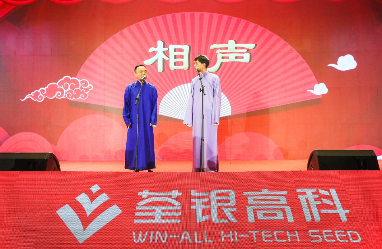 ? ? 聯(lián)歡會(huì)以喜慶祥和的歌舞表演《在希望的田野上》拉開(kāi)序幕,科技公司的《街武》,將武術(shù)和街舞結(jié)合,剛?cè)岵?jì),十分炫酷;玉米公司的相聲《套牌》,道盡了一線種子銷售人員的不易;小品《西游記之女兒國(guó)2》詼諧幽默,令人捧腹大笑;詩(shī)朗誦《我愛(ài)祖國(guó),我愛(ài)荃銀》殷情并茂,音詩(shī)畫(huà)《我和我的祖國(guó)》大氣恢弘,京歌《我是中國(guó)人》激情澎湃,荃銀人用自己的方式歌頌祖國(guó),祝福荃銀。期間,中化農(nóng)業(yè)黨群工作部姚雁主任傾情獻(xiàn)唱《我把太陽(yáng)迎進(jìn)祖國(guó)》以及黃梅戲選段,獲得掌聲陣陣。整場(chǎng)晚會(huì)形式多樣,精彩紛呈,大家載歌載舞,盡顯風(fēng)采魅力,現(xiàn)場(chǎng)還有互動(dòng)抽獎(jiǎng),獎(jiǎng)品豐厚,引得喝彩不斷。今年是荃銀高科上市十周年,加入中化農(nóng)業(yè)一周年,公司經(jīng)營(yíng)班子成員及子(分)公司領(lǐng)導(dǎo)在張琴總經(jīng)理帶領(lǐng)下齊聲高唱《今天是你的生日》,為祖國(guó)、為荃銀送上由衷的祝福。晚會(huì)在高亢的歌聲中圓滿落下帷幕。